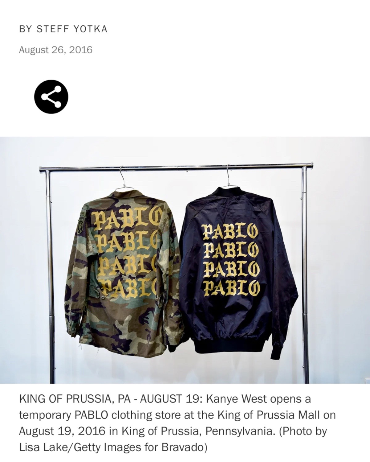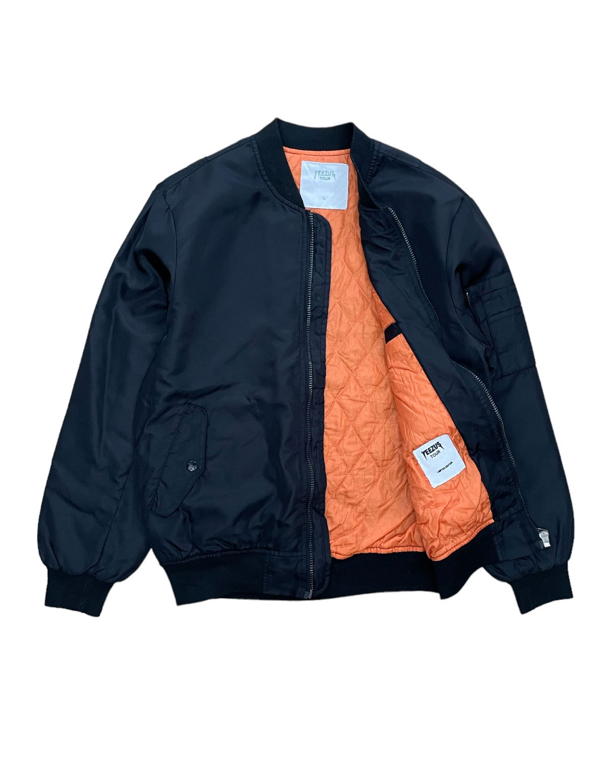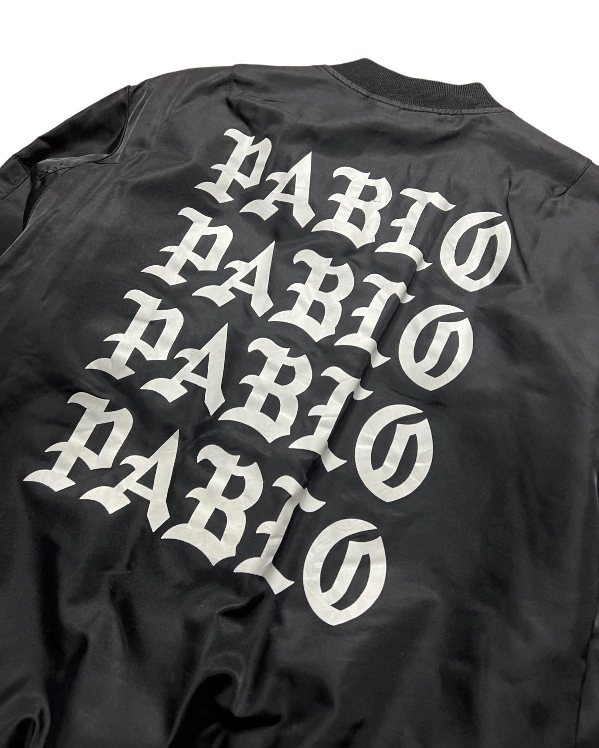 2016 Kanye West Life of pablo, King of prussia mall Pennsylvania USA pop up exclusive bomber jacket with the signature pablo multiline graphic on the back. The Saint Pablo Tour was a concert tour by American rapper Kanye West which ran from August 25, 2016 to November 19, 2016 in support of West's seventh solo studio album, The Life of Pablo (2016). The tour was originally planned to run until December 31, 2016,but was canceled prematurely on November 21, 2016 due to West's hospitalization.It was the 18th highest-grossing tour of 2016 in North America.