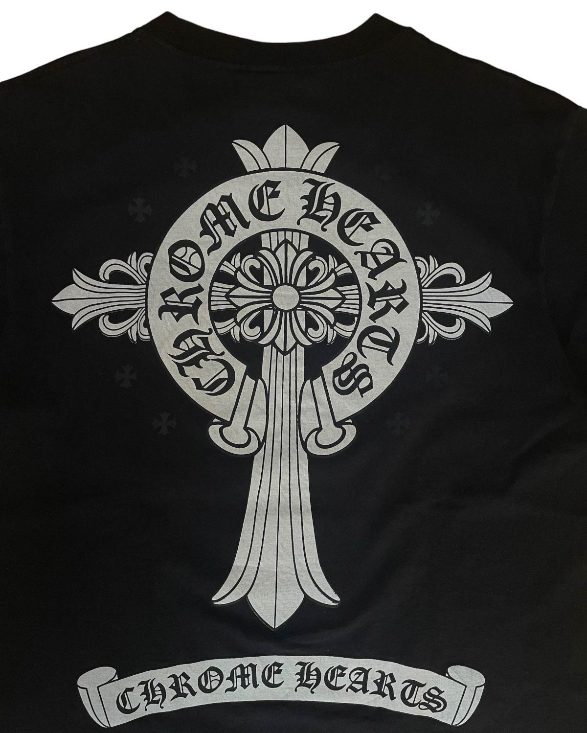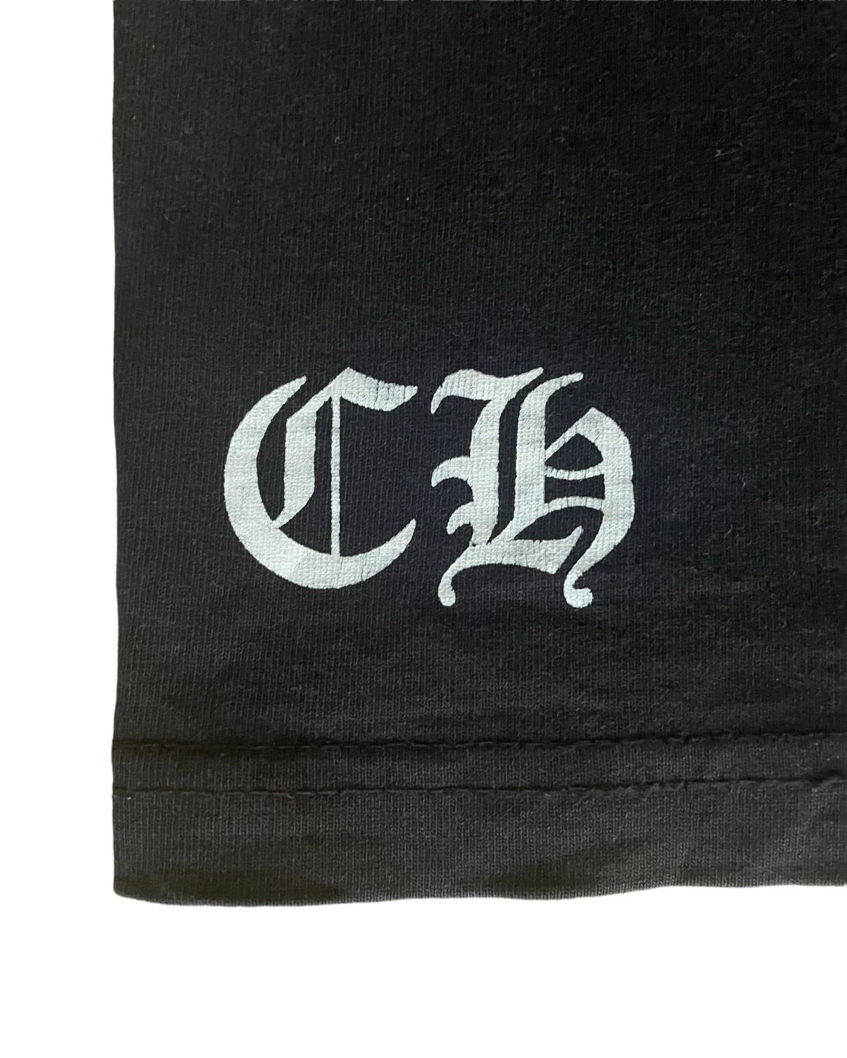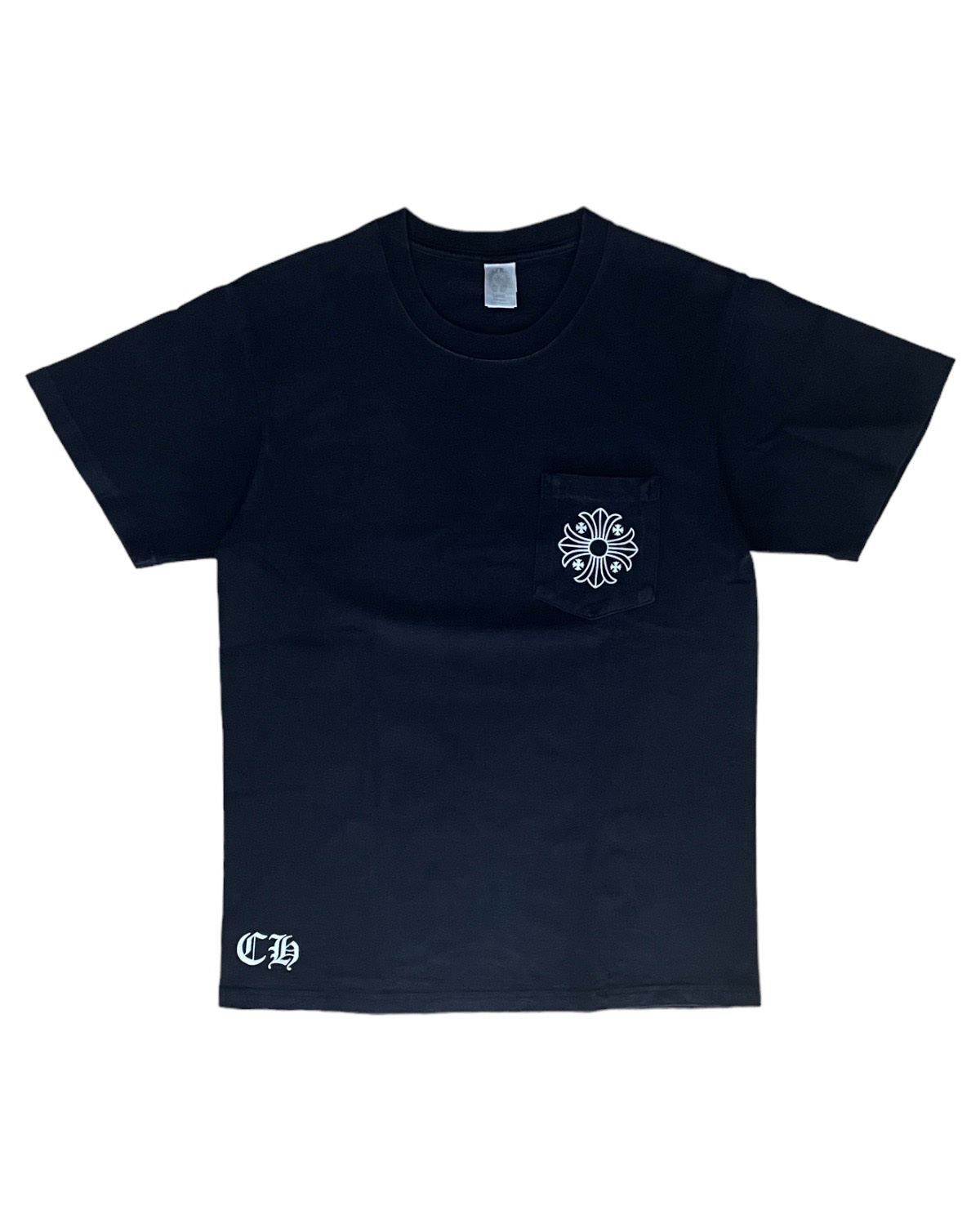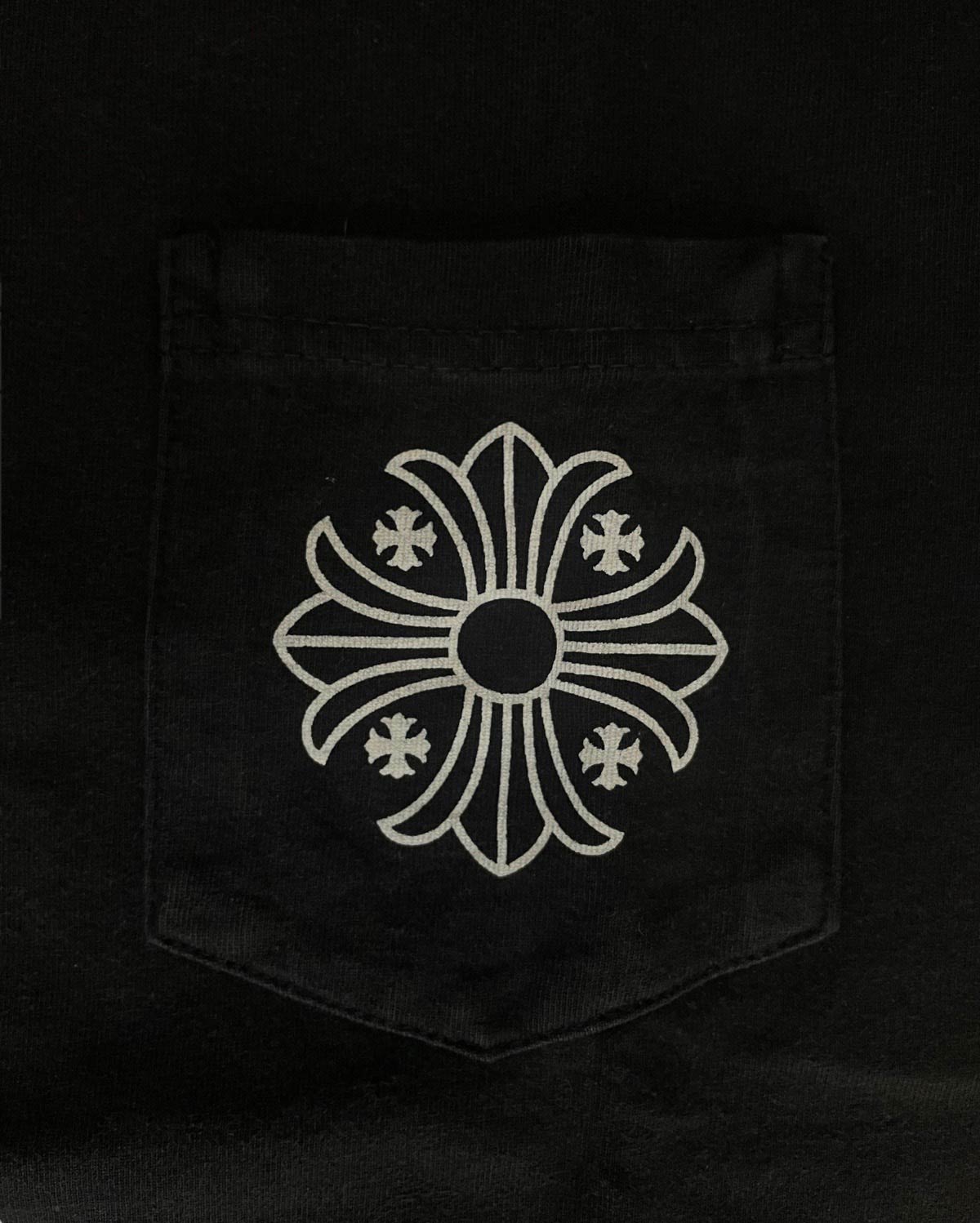Vintage Chrome Hearts Pocket tee with the fleur cross and horseshoe logo on back in a faded black fabric, single cut.