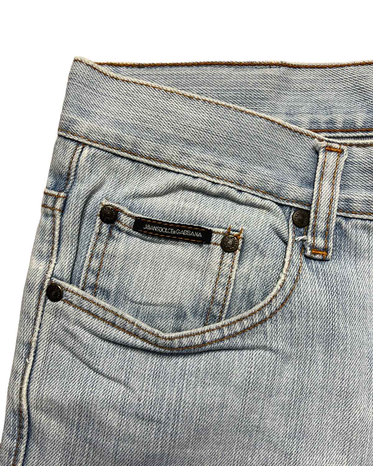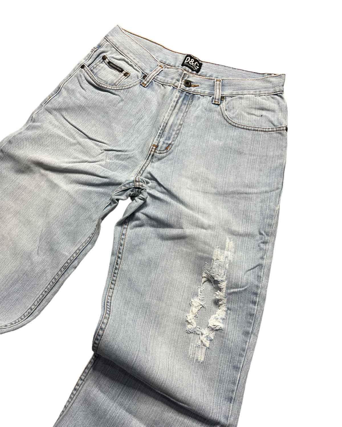 Vintage 1990'S Cropped denim in a light blue colorway with distressing in front and D&G logo embroidered on back pocket.