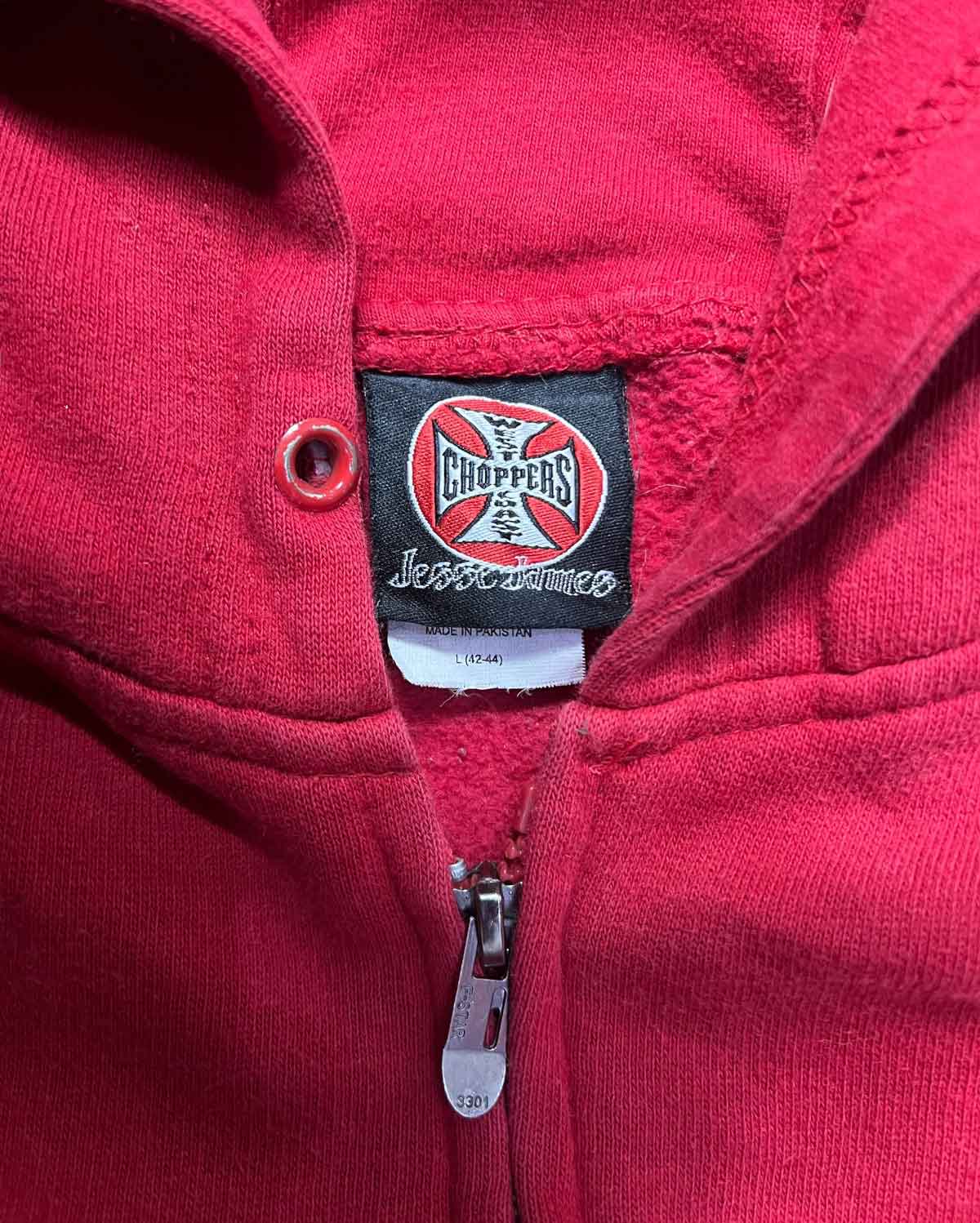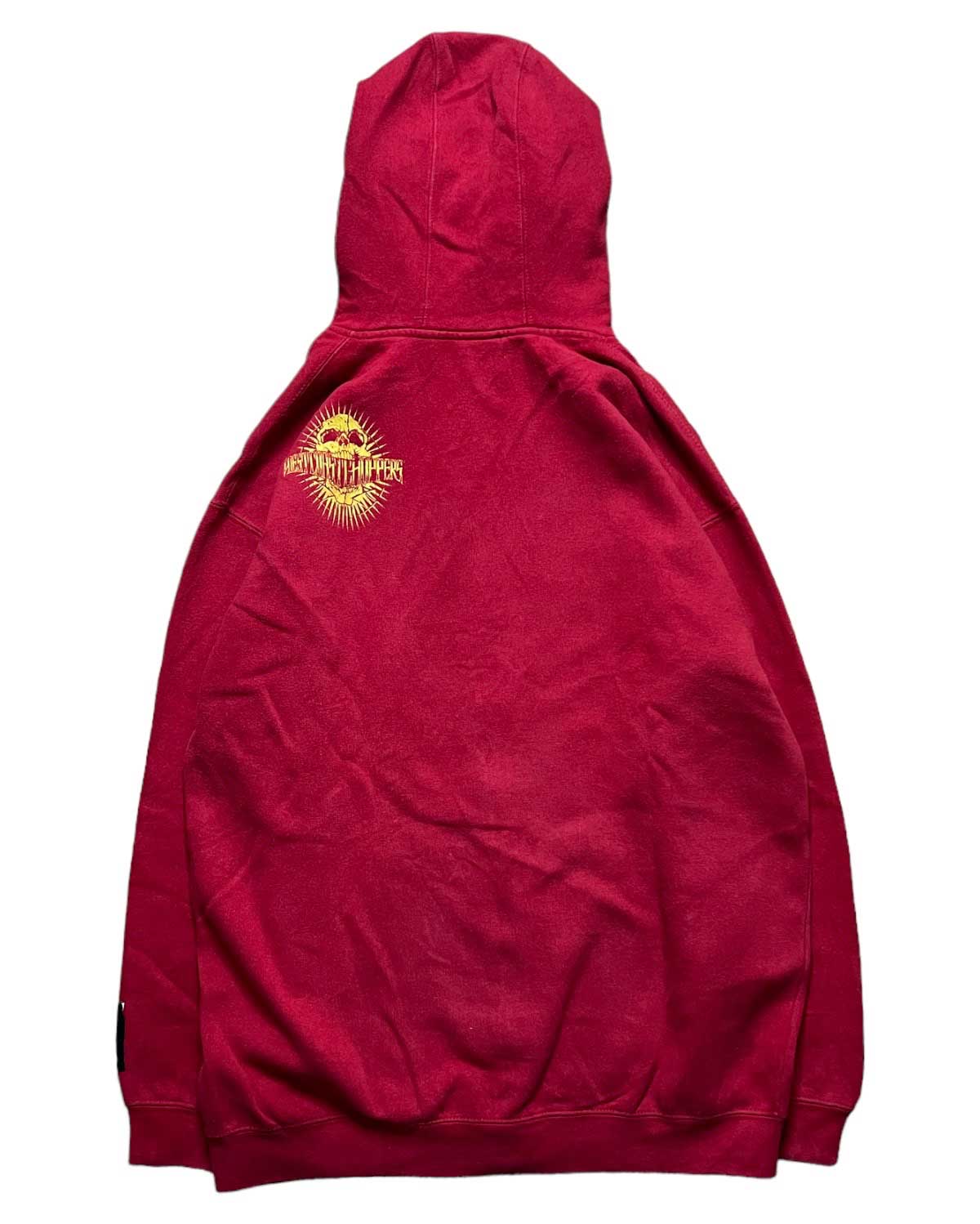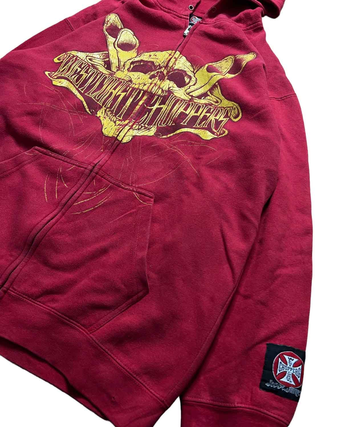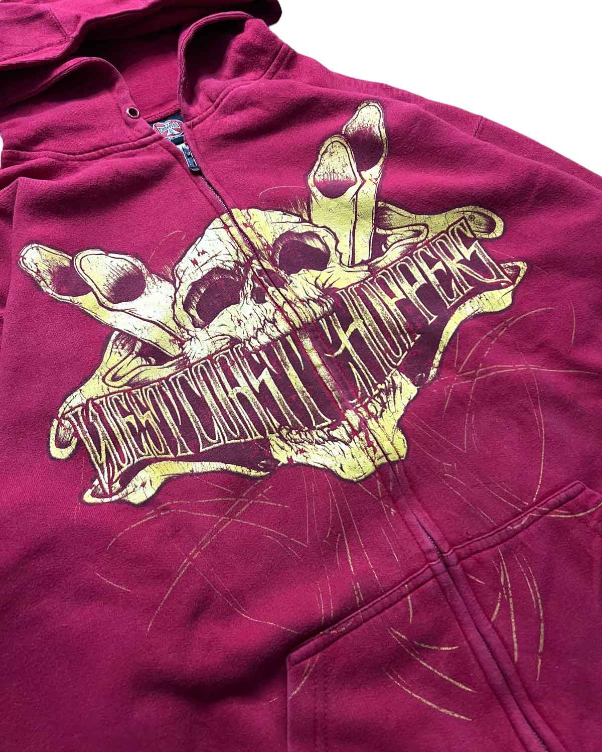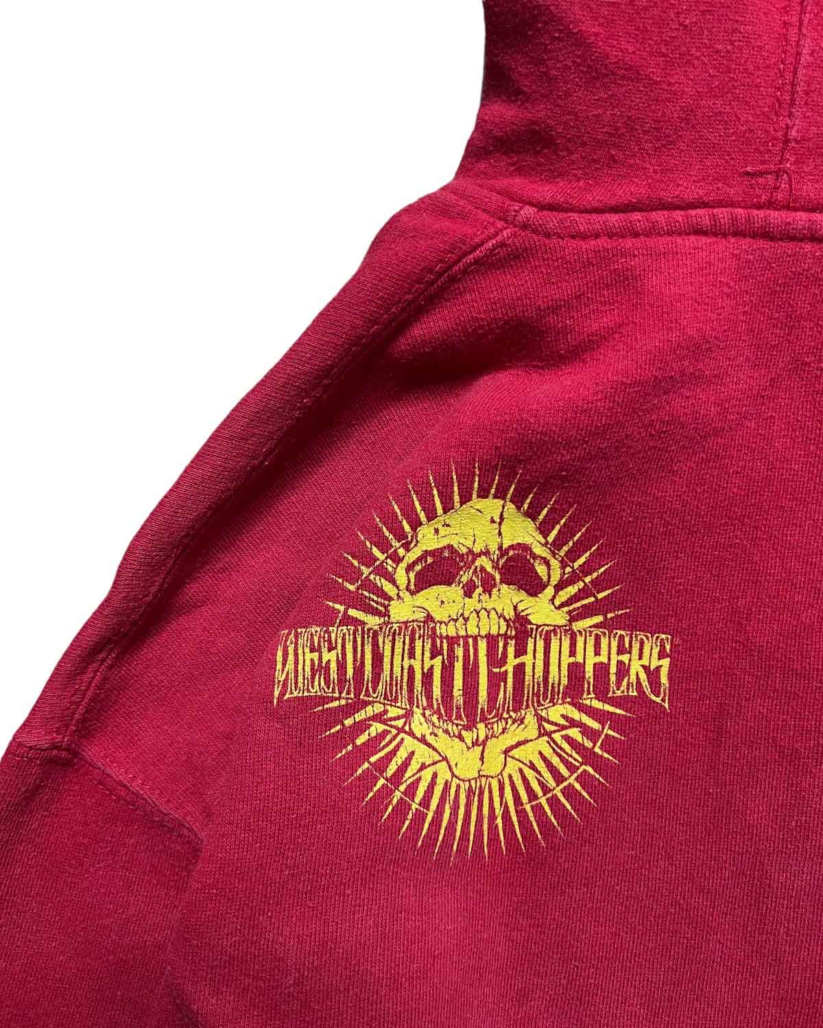 Vintage 1990's West coast chopper sip up hoodie with the skull logo on chest and brands motif woven label sewn on the sleevthere may be distressing, holes, stains due to the age of the hoodie which gives it a unique character.